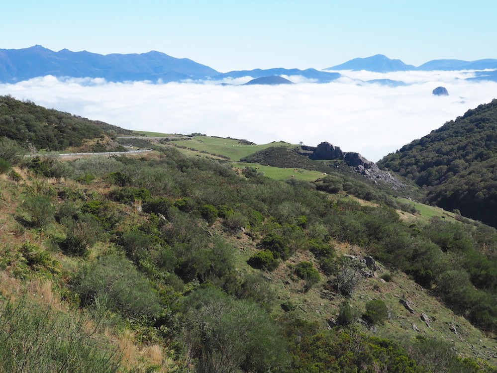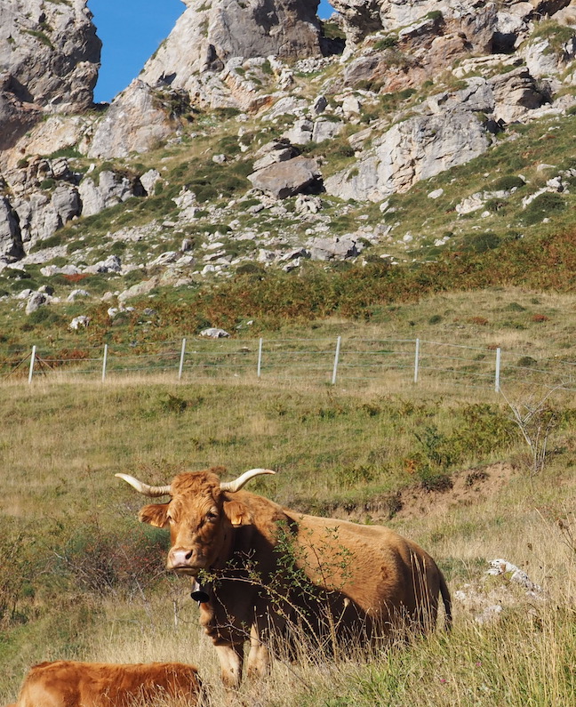 First we must climb the mountain just north of Prioro, where we are staying. It is not small, but we are becoming semi-locals having crossed over it three times in the past two days. With that behind us, we travel through many hamlets along our country road until we pass the entrance to the park that take one to Cain and the george walk. Now we are on a different route to Potes, which the national park gateway to Picos de Europa. We start to twist and turn up another huge mountain.The road is incredibly difficult to drive; it is almost impossible to say how much it turns and how narrow it is. When we reach the pass, we can see over the other side. In the bright sunshine, we are above a cloud bank that fills the valley below. We stop on a mountain top pull-off and I get out of the car to shoot the the surrounding mountain peaks with the clouds below. I walk off the shoulder to get a good view downward and begin to hear the soft clanging of cow bells below. Pastures rise up the entire mountain, and herds of cows are below.
