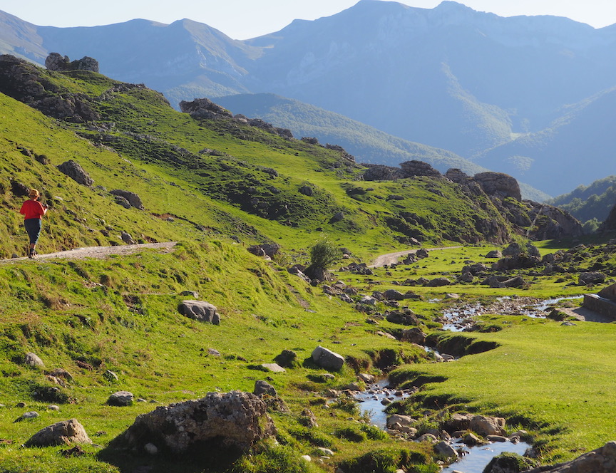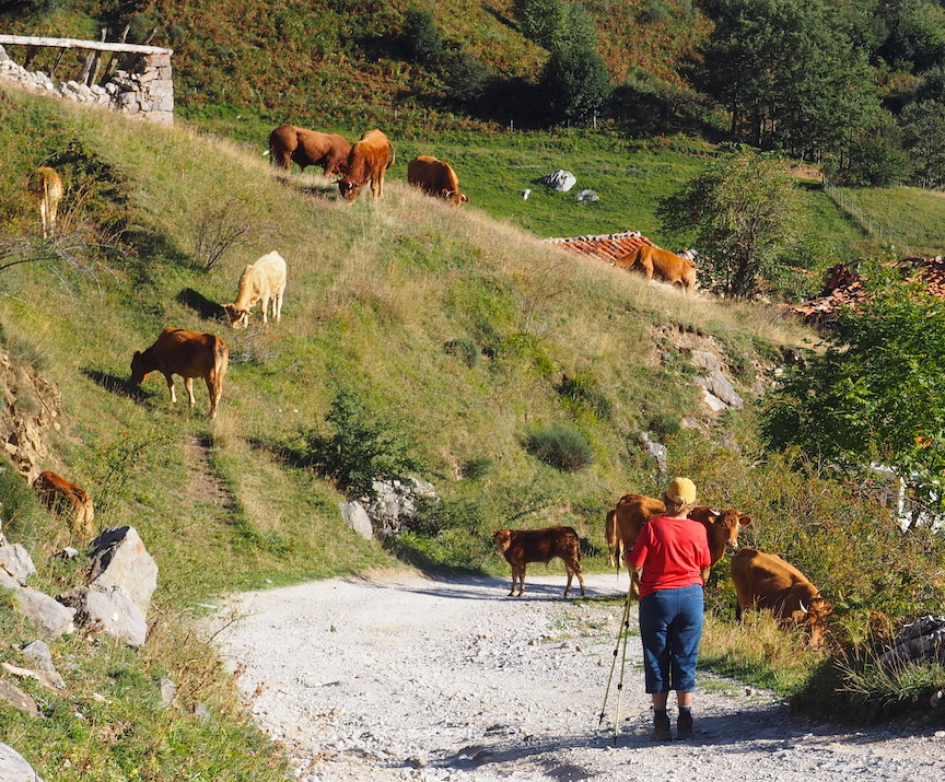 To make things worse for her, an allergy she has, has kicked up. The is blowing her nose and sneezing as we continue down. It is becoming a very long 45 minutes. Now the trail down is steeper and in the woods. It is giving no hope of ending. I have experienced his in the White Mountains many times, but she has not. I know how tired she is of the walk, but there is little I can do to help her get through it. A farmer comes up the wooded lane in a safari truck. Ana flags him down. She wants to know how far the bottom of the trail is? Poco he says, not far. One mans poco, is not another woman’s. A bull emerges on the road fromt the forest. He is bleating a mournful cry, as he is separated from the herd. He is hugh and Ana must pass him. She picks up another stone. We get by the bull and the road is now paved, making the walking a bit easier if still sharply downhill. I sense the end and have moved ahead of Ana. I see buildings. We are walking off the mountain into a village. This does no make sense. We have come out of the trail to the road far down from the parking area. We are in a mountain hamlet substantially below our car. We see a tavern open. I suggest we have a beer and I will walk up to get the car, while Ana waits. She does not want to wait alone. We order a beer and get the bar keep to find us the number of a cab. It takes two tries to finally get a cab to come, but when he does, it is the best 10 Euros I have ever spent. We were facing a four mile walk up hill. Neither of us had it in us. It is pretty much dark when we get to the car. We forgo dinner in Potes in favor of the nightmarish drive over the mountain. We will eat scrammbled eggs in our apartment in Prioro and get home before midnight. I do the drive, Ana cooks the eggs. She is sore and not used to this kind endurance test. She is not sure she will get out of bed tomorrow to walk to see the wild horses.