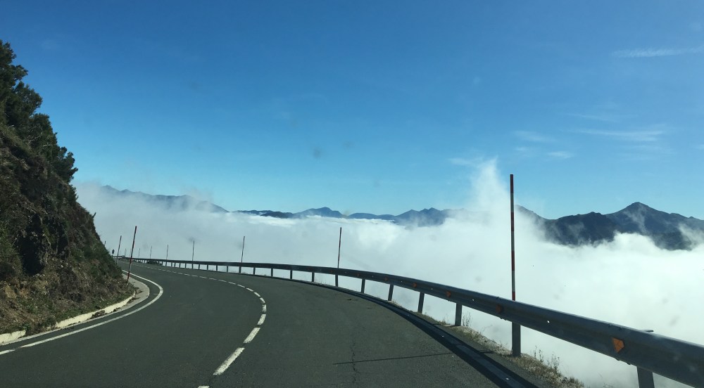 We are heading down and the drop offs to our outside are simply spectacular. The curves are continuous and frightening. Soon motorcyclists start coming by in groups; the first groups racing at unwise speeds. Later, more come behaving more respectfully. After the second group of binkers, there is a 1000 pound cow standing in the road broadside. We slow to a crawl not sure if we should use the other lane not sure if the cow will continue across? A few miles later we will find multiple cows on the narrow road. Forgive me if I didn’t count them. We work our way through the herd and continue downward. The vistas continue to be amazing! The drive a test of courage.