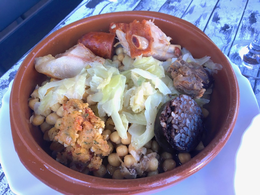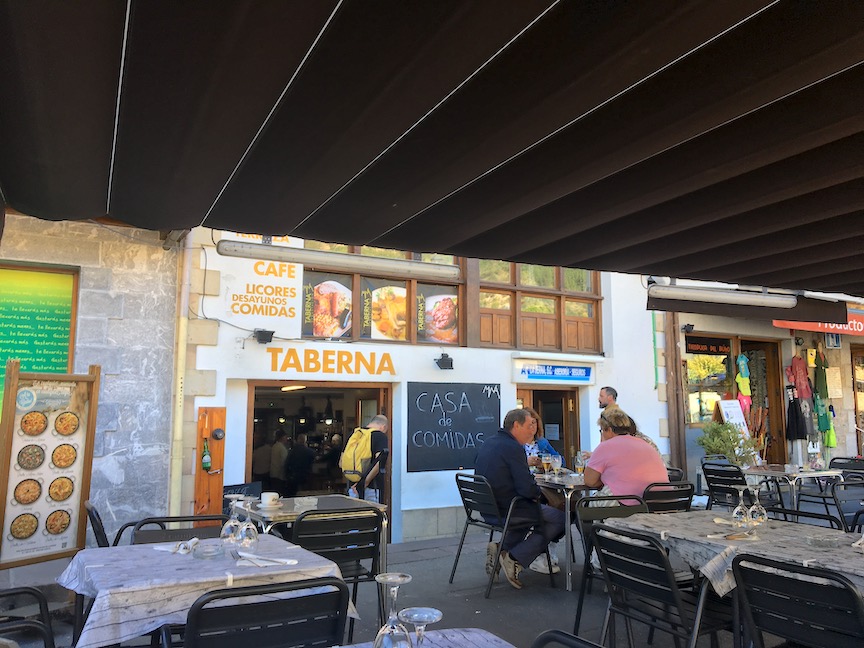 At the bottom of the mountain we find Potes. It is a typical gateway town to a major park. Clean and bright and busy. We decide, having found a parking space, it would be wise to lunch here. I want to find something quickly, eat and be on our way. There is an outdoor cafe that is open at noon across from our parking lot. It does not look to special, but we need to move on. The woman working the out door tables is friendly and explains for 12 euros we can get a menu of the day lunch. Oh, well. Why not. Soon we are eating a brothy noodle soup, with shared plate of local sauges and meats and garbanzos beans. Peasant fare. Of course the meal includes a bottle of red wine. We have the good sense to take most of the bottle with for later.