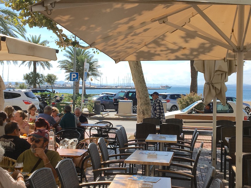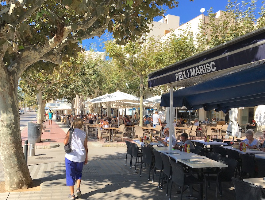 We walk down to the harbor through the pleasant, narrow pedestrian streets. It is a very nice harbor and there are many restaurants on it. We pick one that is mostly seafood served Italian style. I am pleased to have a spaghetti served fruti del mar with a red sauce. Ana orders grilled calamari; we share a nice salad with avocado, nuts and fruit. Thankfully, canned tuna is not a part of the Catalonia salads (like it is otherwise all over Spain). The restaurant is lively and we enjoy watching the customers, especially a couple with a small bull dog. They are large people and the dog looks like the husband. I ask Ana if the lady got the dog because it looked like her husband; or the husband because he looked like the dog. Later they surprise us when they leave, when both pick up motor cycle helmets. They are not otherwise dressed for riding, and where do they put the dog?