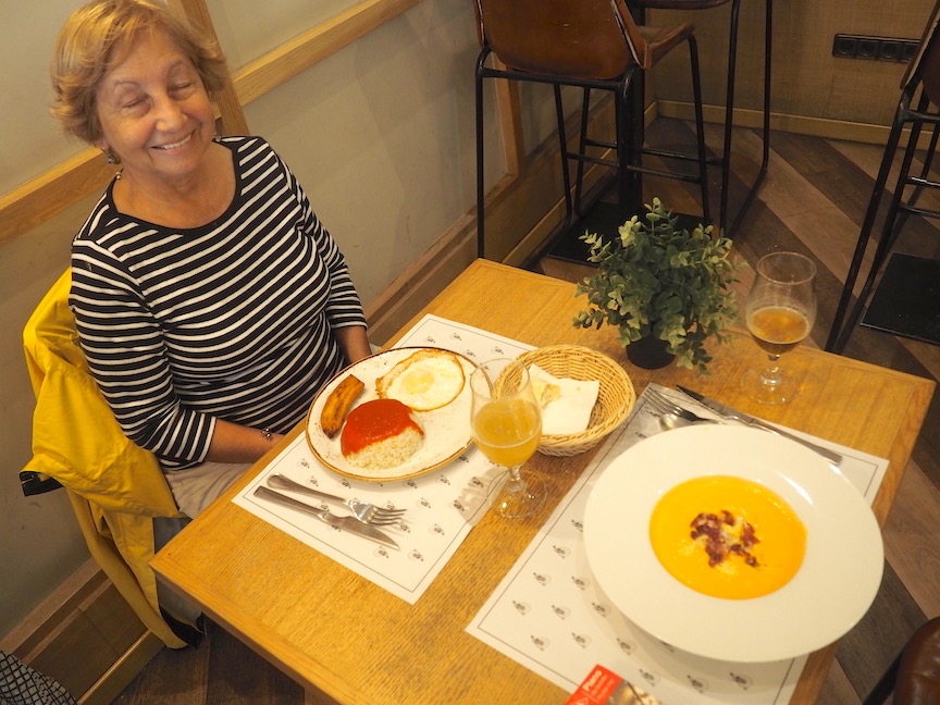Turned back out in to a heavy rain, we decided to try the Metro to get back. With some help from a Metro attendant, we reloaded our card and made our way rather quickly and comfortably back avoiding an hour long walk in the rain. Once near our apartment, we survey local restaurants and had a late lunch-early dinner. I went for salmorejo, a cold soup like gazpacho, but with a base of pureed tomato and bread, topped with ham shreds and grated boiled egg. It tastes a bit creamier than gazpacho, which is thinner and has small bits of the vegetables. Then I had seared Tuna. Ana had a Cuban rice dish which was served with a fried egg. Fried eggs seem to be apart of many dishes in Spain. I avoid them. She finished with a plate of ribs and french fries. We both enjoyed our meals and were full enough to skip a late dinner.