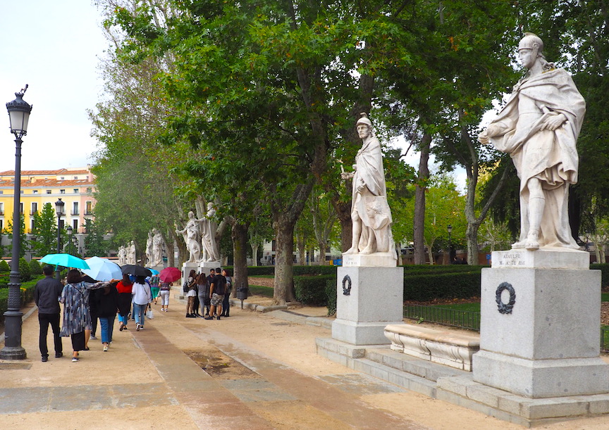 We enjoy a breakfast on our terrace, but it is cooler and windier than the day before. I check the forecast and see some amount of rain is likely all day. We dress warmer than expected and gather rain gear and umbrellas for our walk. It will drizzle off and on until we get to the Cathedral. We walk through Plaza Mayor for another look and I find a shop to buy a Madrid baseball cap which will be helpful keeping the rain off my glasses. (Note: clicking on the grouped photos will enlarge them.)