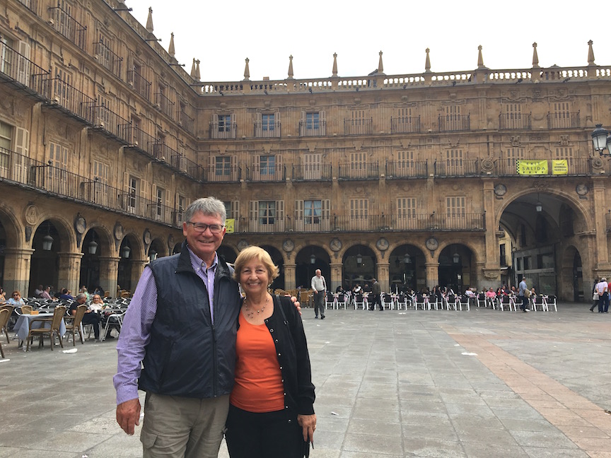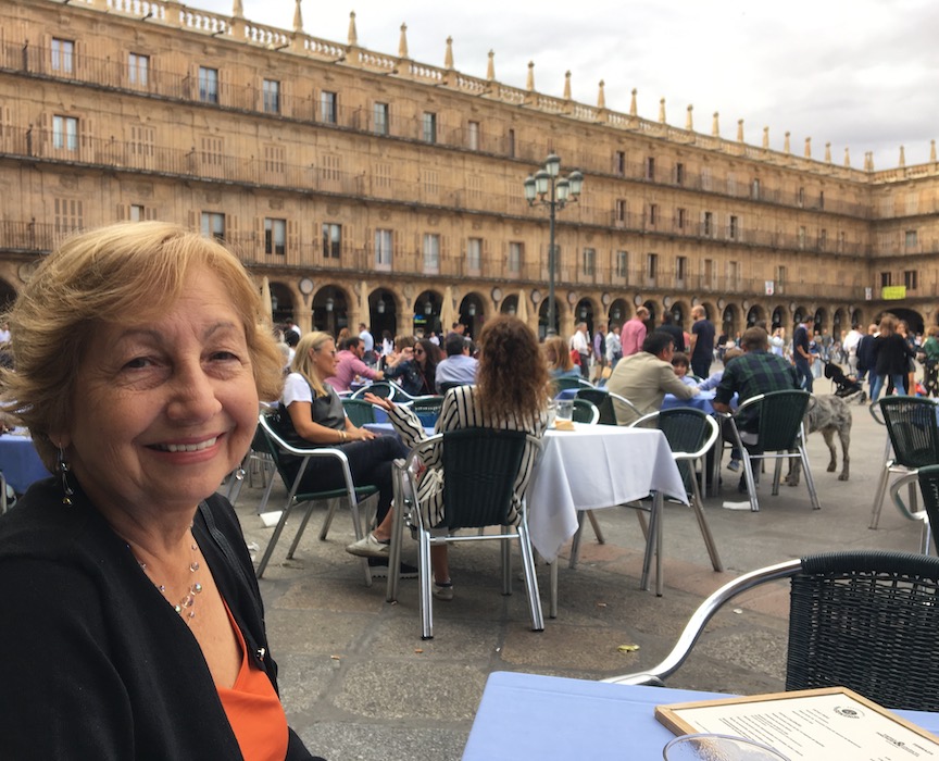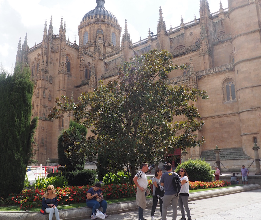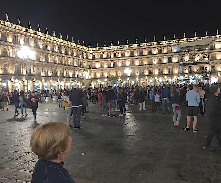 The GPS works better coming into Salamanca than it usually does in old cities. When the gps says, ” Arrived.” We find ourselves in front of the apartment with owner grinning at us from across the narrow city street. He tell us to unload the luggage and then take the car to parking that has been pre-arranged. This is a blessing, as we will shortly learn that the city is packed with revelers celebrating Salamanca’s annual festival. This is a University town and the students are back and parents are visiting. The old town is packed with people. Parking would have been impossible. The owner takes me six block to a parking lot in a basement, where I must snake the car through pillars, on a curved route to the parking space. It is good we have a small car for this; though I still must stop and back up several times to make the necessary turns. Finally, he gets me into the space assigned. I have seen more difficult parking lots (in Antibe, France), but not much.