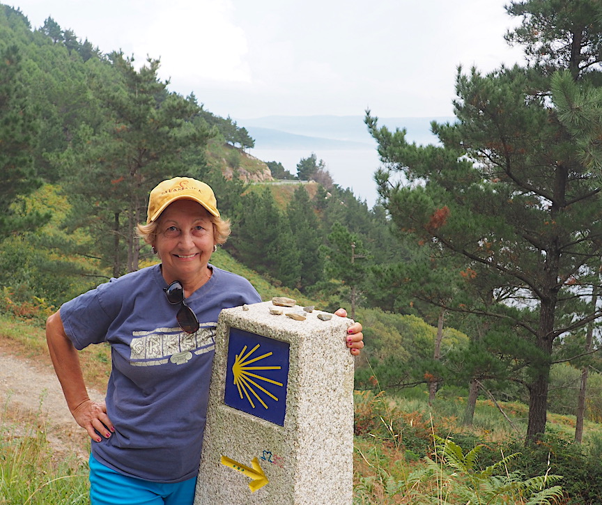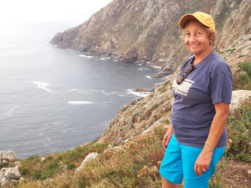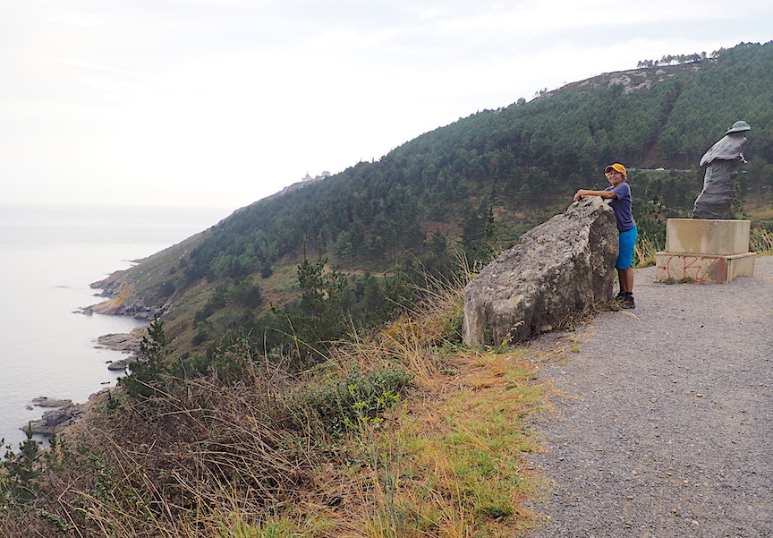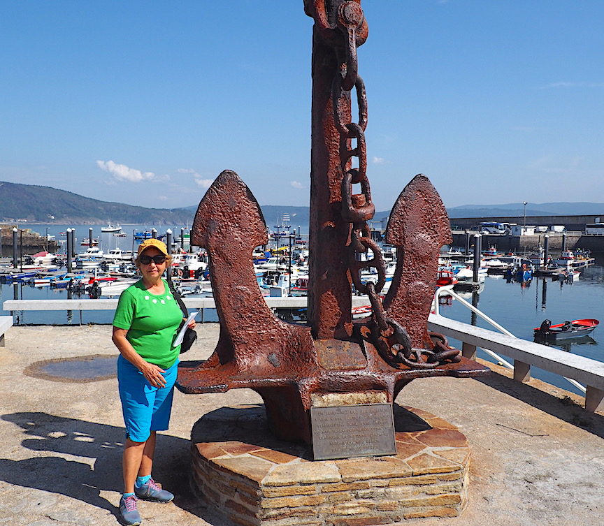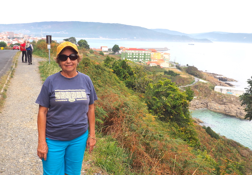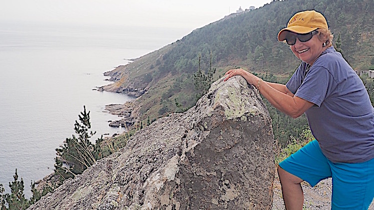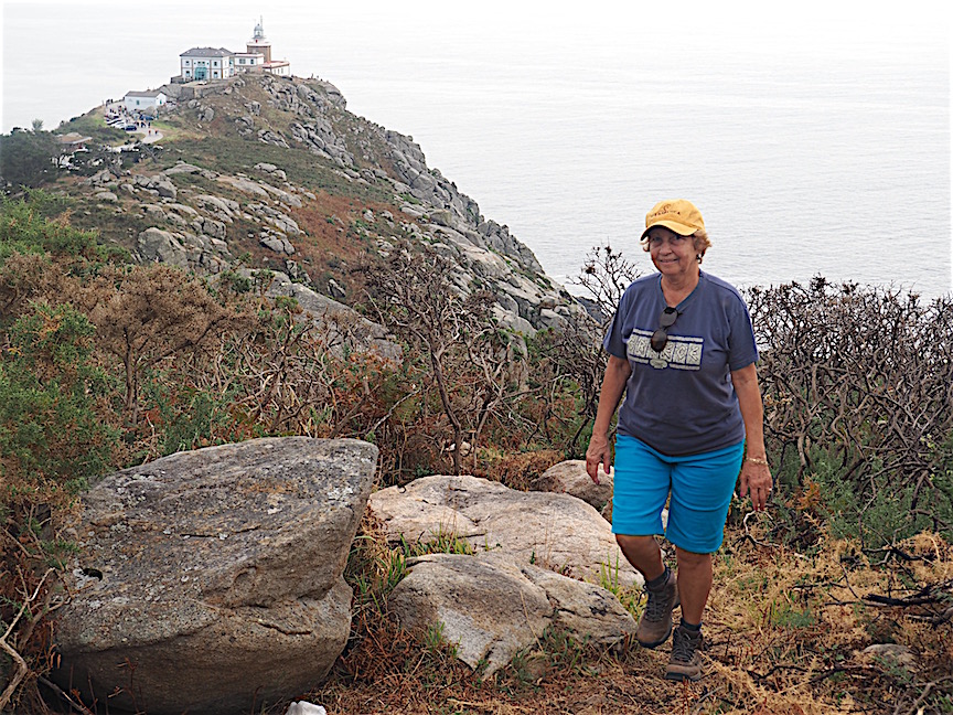 In town, the path to the lighthouse is well marked and follows a road which allows one to drive there as well. There are many hikers on the path, some look like real pilgrims, others tourists like us. The path rises quickly and soon we have spectacular views of the bay hundreds of feet below. Ana posses for photos next to the Camino markers along the way, enjoying the pretense of being a pilgrim. The lighthouse is on a large rocky point high above the sea. There is nearby parking and plenty of tourists milling and climbing out on the rocky elevation. We shoot photos and enjoy the view. When we decide to return, I see a path that is away from the road and rises steeply up hill above the lighthouse. I suggest we take it; and to my surprise, Ana is willing. She does remarkably well hiking on our trips without preparing with much hiking at home. I am impressed with her willingness. We climb the very steep trail along a cliff and then higher on a little path. We take some marvelous photos hundreds of feet above the lighthouse, that look way out to the Atlantic. It is much like the coast of Maine here, green and mountainous along the sea. It is quite wonderful.