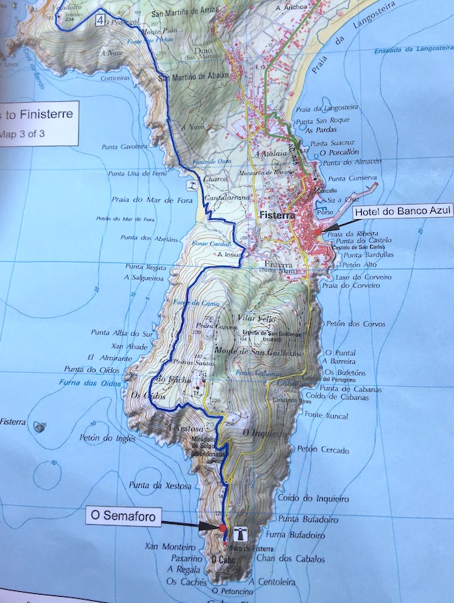 We have climb quiet high, much higher than I expected. I have seen a road going higher with cars on it. We climb through the rocky fields to reach it. I tell Ana despite what the police have told us, the road must go back to town like my map suggests. Because it is a paved road, she is willing to continue. But we are both aware that it is after 6 p.m. and we have only until about 8 p.m. until dusk. We keep climbing on the paved road, when we meet some Brits from Brighton. They have hiked along way upward from a beach. We ask if they think we can return to Fisterra going over the little mountain. They produce a topo map of the peninsula and tell us to photograph it with my phone. It shows lesser routes to Fisterra, perhaps dirt roads through this park area. We start down one, but decide not to be lost in the dark. The paved road will get us back for sure.